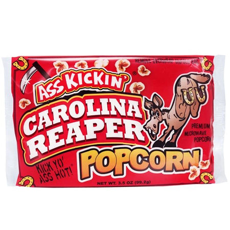 Warning: This popcorn bites back. đ„ Introducing Ass Kickinâ Carolina Reaper Popcorn â the microwaveable snack that says, âyou wanted heat? Buckle up.â This isnât your grandmaâs buttery puffed corn. Oh no. This bag is laced with ground Carolina Reaper Pepper, which just so happens to be the hottest pepper on Earth. Youâll get a little savory garlic flirt at first... and then WHAM! Your taste buds get suplexed into next week. Perfect for heat-seekers, daredevils, and that one cousin who thinks they can handle